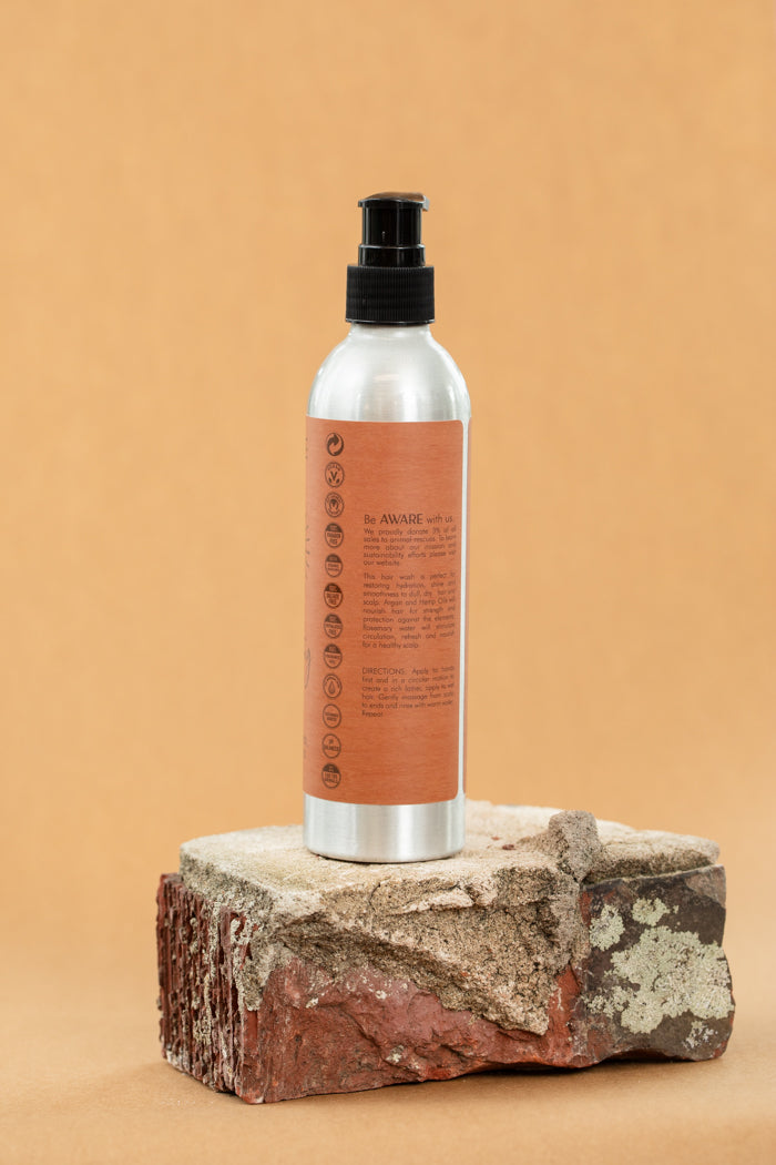 Our Hydrating Hair Wash is perfect for restoring hydration, shine and smoothness to dull, dry hair and thirsty hair and scalp. Argan and Hemp Oils will nourish hair for strength and protection against the elements. Rosemary water will stimulate circulation, refresh and nourish for a healthy scalp.